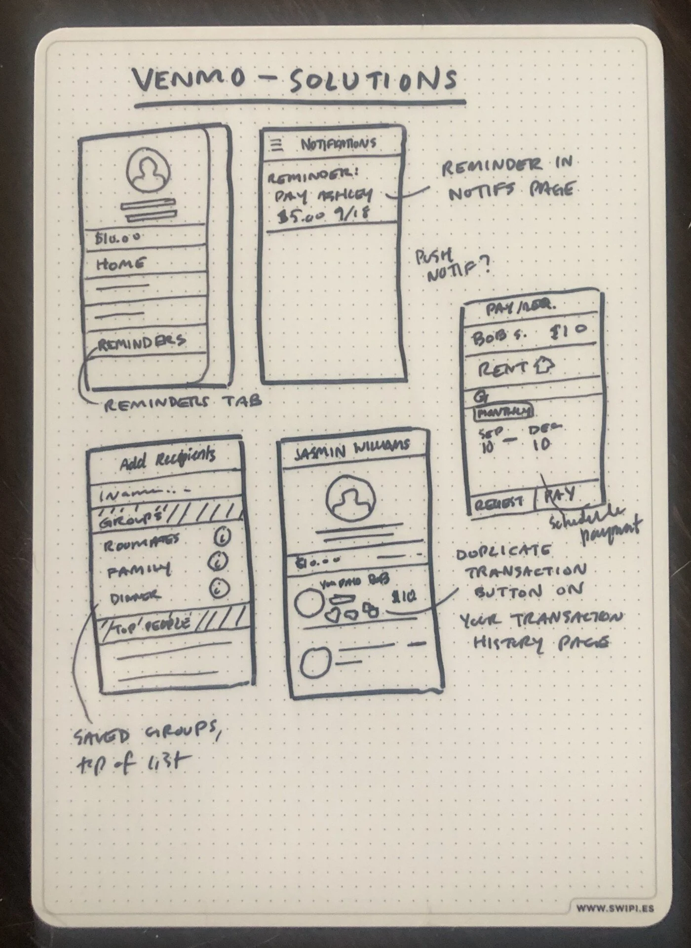 This solution optimizes for planned and/or recurring transactions. While some transactions on Venmo are one-offs that require entirely new inputs (recipients, payment amounts, descriptions) and need to happen immediately, the ability to schedule and repeat payments and requests for a future date allows users to automate the predictable aspects of their money transaction needs.